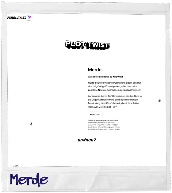 Während die Zerrbilder aus dem Unterbewussten dieser Seite in hilfloser Hektik vorbeiflimmern wie in einem belanglosen Film, freut sich Gott darauf, deine Lösung zu erfahren. Er möchte sie, wenn möglich, monetarisieren. Wie auch sein Sohn, alles, was in seinem Namen geschah, entweder mit Blut oder mit Blattgold überzog. Wir sehen es ihm nach und huldigen seinen smoothen Cloudwalk mit den sakralen Worten: Ey Gott, was geht, wo ist dein Fisch?